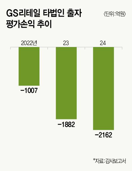 GS리테일 사업보고서에 대규모 타법인 출자 지분 평가손실이 기록된 건 3년 전이다. 2022년 1007억원을 시작으로 2023년 1882억원, 지난해 2162억원이 잡혔다. GS리테일이 본격적인 스타트업 투자를 진행한 직후다. 타법인 출자 지분 평가손실은 말만 복잡할 뿐, 단순한 개념이다. 예를 들어 GS리테일이 A기업의 지분 10%를 사들이며 100억원을 썼다고 가정해보자. A기업이 계속된 적자를 낸다면, 이는 지분법 손실로 이어지고 해당 기업 장부가 조정 요인으로 작용한다. 현재 A기업 지분 10% 가치가 10억원까지 떨어졌다면 GS리테일은 90억원의 타법인 출자 지분 평가손실을 기록해야 한다. GS리테일 투자처는 대부분 비상장사다. 지난해 말 기준 총 6곳의 상장사와 129곳의 비상장사에 출자한 상태다.