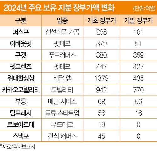 다른 투자처로 눈을 돌려도 상황은 비슷하다. 2018년 GS리테일이 투자한 반려동물 전문 플랫폼 어바웃펫 보유 지분 66%의 가치는 지난해 초 379억원에서 지난해 말 51억원으로 쪼그라들었다. 1년 만에 328억원이 증발한 꼴이다. 자본잠식 상태인 어바웃펫은 결손금만 884억원에 달할 만큼 위태로운 나날을 보내고 있다. 결손금은 기업 순자산이 감소할 때 감소분을 누적해 기록한 금액이다. 영업손실이 지속되면서 결손금 규모가 빠르게 커지고 있는 상황이다. 푸드 커머스 기업 쿠캣도 평가손실이 발생했다. 지난해 초까지는 보유 지분 47%의 가치를 380억원으로 봤지만 지난해 말에는 359억원으로 낮췄다. 2021년 야심 차게 투자했던 카카오모빌리티도 장부가 하락을 못 피했다. GS리테일은 카카오모빌리티 보유 지분 1.3%의 가치를 지난해 초 942억원에서 지난해 말 770억원으로 하향 조정했다. 카카오모빌리티는 2022년 주요 FI였던 TPG컨소시엄이 대신증권에 700억원가량 소수 지분을 팔 때 7조8000억원 기업가치를 인정받았다. 하지만 현재 기업가치는 5조원 안팎에 그칠 것이라는 게 관련 업계 평가다. 모빌리티 산업 특성상 골목상권 침해 논란에 따른 정부 규제가 사업 확장을 막아서고 있기 때문이다.