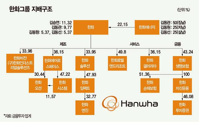 현재 한화그룹은 ‘한화에너지-㈜한화-계열사-증손자회사’로 이어지는 지배구조를 갖고 있다. 특히 한화에너지가 사실상 지주사 역할을 하는 ㈜한화 지분을 보유해 옥상옥 구조다. 한화그룹은 금융 계열사를 두고 있는 탓에 지주사 체제는 아니지만, ㈜한화가 지주사 역할을 한다.