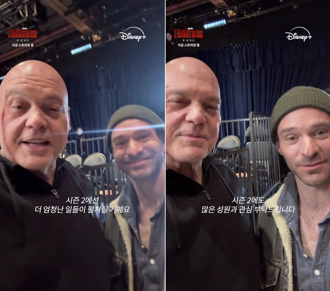 지난 16일 마블 텔레비전 오리지널 시리즈 '데어데블: 본 어게인'이 마지막 에피소드를 공개하며 막을 내린 가운데, 시리즈의 주역 찰리 콕스와 빈센트 도노프리오가 직접 시즌2 공개 확정 소식을 알렸다.