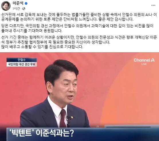 이어 "선거 기간 중에는 함께하기 어려운 상황이지만, 안철수 의원의 전문성과 식견은 향후 개혁신당 이준석 정부가 추진할 협치정부에 꼭 필요한 중요한 자산이라 생각한다"고 자신의 당선 및 안철수 후보의 낙선 전망은 분명히 했다.