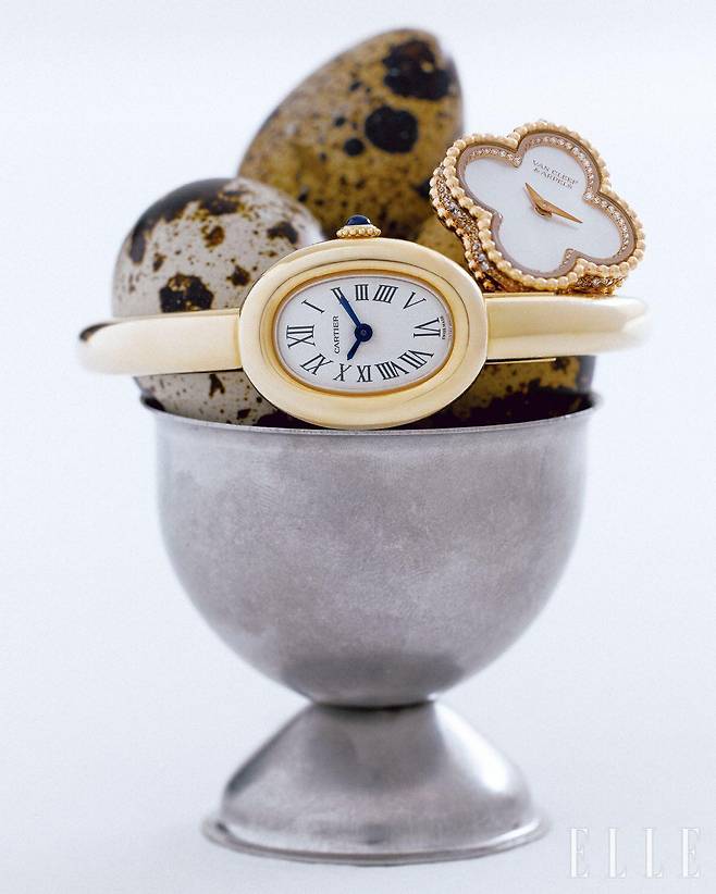 옐로골드 케이스와 브레이슬릿, 카보숑 컷 사파이어를 세팅한 크라운을 갖춘 베누아 드 까르띠에 워치는 1천9백만원대, Cartier. 스트랩 탈착이 가능하며 로즈골드를 세공한 비즈로 네 잎 클로버 케이스를 장식한 스위트 알함브라 워치는 1천1백80만원, Van Cleef & Arpels.