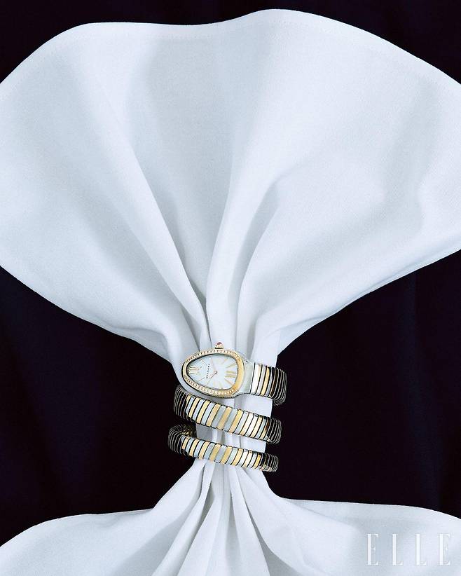 냅킨 링으로 연출한 뱀 모티프의 나선형 브레이슬릿과 로즈골드 베젤에 다이아몬드를 세팅한 세르펜티 투보가스 워치는 가격 미정, Bvlgari.
