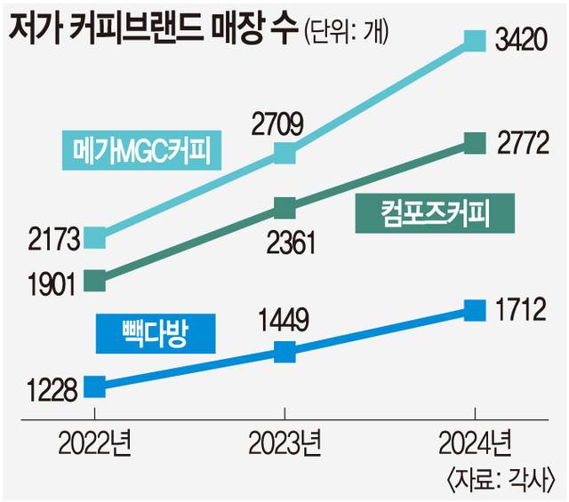 저가 브랜드 카페의 실적은 매년 신장하고 있다. 메가MGC커피 운영사 앤하우스의 지난해 매출은 전년 대비 36.4% 증가한 4660억원이었고 영업이익은 55.1% 증가한 1076억원으로 집계됐다. 같은 기간 컴포즈커피는 매출 897억원(전년 대비 0.8% 증가), 영업이익은 400억원(8.9% 증가)이었다. 매장 수도 급격히 늘어나 지난해 말 기준 메가MGC커피는 3420개, 컴포즈커피는 2772개에 이른다. 스타벅스 매장 수(2009개)를 훌쩍 뛰어넘는 수치다.