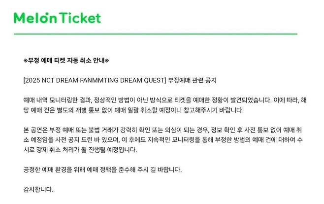 이날 멜론티켓은 NCT DREAM 팬미팅 부정예매 관련 공지를 통해 "예매 내역 모니터링 결과 정상적인 방법이 아닌 방식으로 티켓을 예매한 정황이 발견됐다"며 "해당 예매 건은 별도의 개별 통보 없이 예매 일괄 취소할 예정이니 참고하길 바란다"고 안내했다.