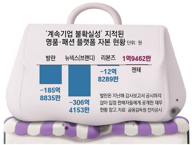 23일 본보는 기업 분석 전문가 박동흠 회계사와 명품·패션 플랫폼 10곳의 재무 상태를 분석했다. 미정산 사태를 일으킨 발란을 포함해 머스트잇, 트렌비, 젠테, 리본즈, 오케이몰(이상 명품), 무신사, 에이블리, 브랜디, 라포랩스(이상 패션) 등 10곳 가운데 발란, 뉴넥스, 리본즈, 젠테 등 4곳은 계속기업 불확실성이 지적됐다.