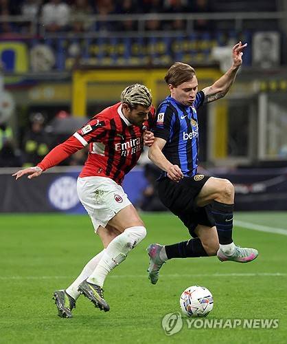 epa12049993 AC Milan's Theo Hernandez (L) challenges for the ball with Inter Milan's Nicola Barella during the Italian Cup semi final second leg soccer match between Inter and Milan at Giuseppe Meazza stadium in Milan, Italy, 23 April 2025. EPA/MATTEO BAZZI