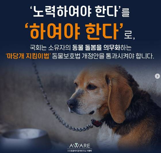 '의무를 이행하지 않는 행위를 동물 방임으로 정의, 금지하고 과태료 등을 부과해 실효성 있는 수준으로 동물보호법 제 7조를 개정할 필요가 있다.'