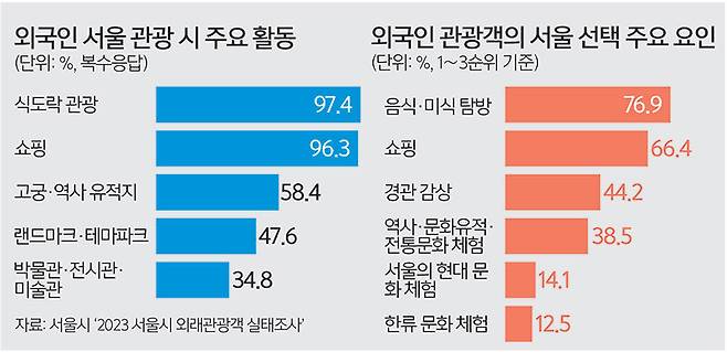 23일 ‘서울시 외래관광객 실태조사’ 결과에 따르면 2023년 서울을 방문한 외국인 관광객이 가장 많이 참여한 관광활동은 ‘식도락 관광’으로 97.4%(중복 응답)에 달했다. 관광객들은 쇼핑(96.4%)보다도 맛집에 더 많은 관심을 보였다. 서울을 여행지로 선택한 요인 중 1위도 ‘음식·미식 탐방’(76.9%, 1∼3순위 기준)으로, 외국인 관광객이 ‘미식 관광지’로 서울을 택하고 있다는 분석이다.