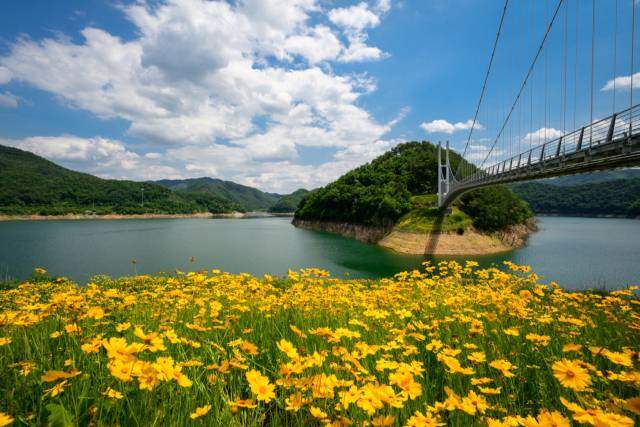 이곳에서는 호수 위에 펼쳐진 벚꽃 길을 따라 걷거나, 댐 상류에 위치한 용마루 공원에서 산책로를 따라 로맨틱한 풍경을 즐길 수 있다. 봄이 깊어지면 공원 일대는 금계국으로 뒤덮이며 장관을 이룬다.
