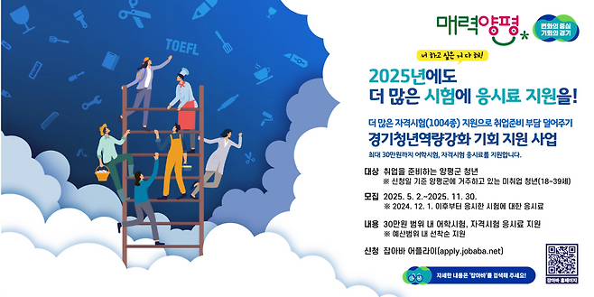 [헤럴드경제=박준환 기자]양평군(군수 전진선)이 관내 거주 미취업 청년을 대상으로 취업에 필요한 어학 및 자격시험 응시료를 지원하는 ‘2025년 경기청년 역량 강화 기회 지원 사업’을 추진한다.