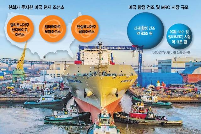 MRO 시장 또한 매년 커지고 있다. 미 회계감사원에 따르면 2023년 미 해군은 함정 MRO 사업에 73억7900만 달러(약 10조4800억원)를 썼다. 2020년 60억9300만 달러에서 3년만에 10억 달러가량 늘었다. 업계 관계자는 "동맹국의 군함 건조가 가능해지더라도 미 정부는 해외보다 자국 내 건조 방식을 선호할 수밖에 없다"며 "한화그룹이 현지 건조 조건을 바탕으로 유리한 고지를 점할 것으로 보인다"고 말했다.
