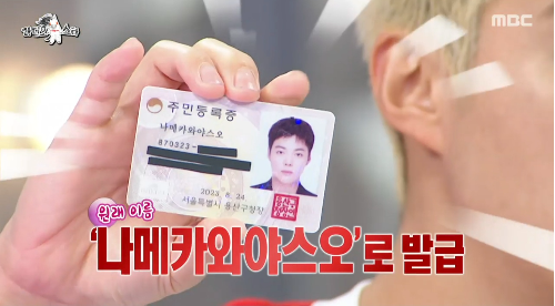 하지만 그의 본명은 아직도 ‘나메카와 야스오’. 방송에서 이 이름이 공개되자 MC들은 “근데 이름이…”라며 놀라움을 감추지 못했다.