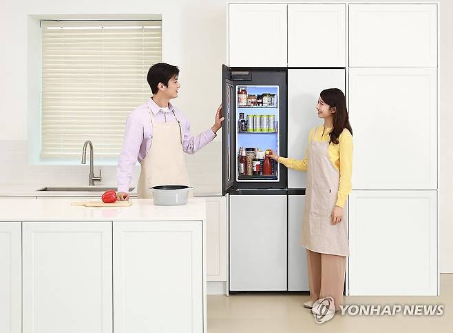 (서울=연합뉴스) 삼성전자가 키친핏 냉장고 모델 최초로 '푸드 쇼케이스' 도어를 적용한 '비스포크 AI 하이브리드 키친핏 맥스' 신제품을 출시한다고 24일 밝혔다. 모델이 '비스포크 AI 하이브리드 키친핏 맥스'를 소개하고 있다. 2025.4.24 [삼성전자 제공. 재판매 및 DB 금지]