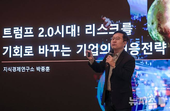 [서울=뉴시스] 정병혁 기자 = 박종훈 지식경제연구소 소장이 24일 서울 중구 웨스틴조선호텔에서 열린 제278회 경총포럼에서 '트럼프 2.0시대 위기를 기회로 바꾸는 기업의 대응전략'을 주제로 발표하고 있다. 2025.04.24. jhope@newsis.com