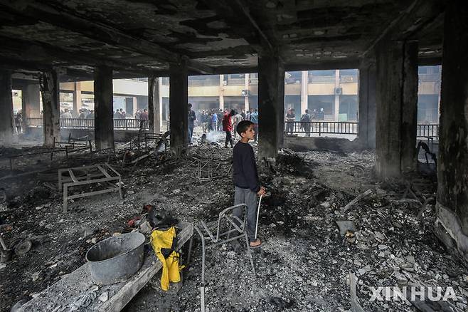 [가자시티=신화/뉴시스] 23일(현지 시간) 가자지구 가자시티의 한 학교에 대피해 있던 팔레스타인 주민들이 이스라엘의 공습으로 파손된 건물 잔해를 살피고 있다. 이스라엘군 당국은 이날 성명을 통해, 피란민들이 머물고 있던 학교를 겨냥한 야간 공습은 이곳에 숨어있는 무장세력을 목표로 한 것이라고 밝혔다. 가자 보건 당국은 이번 공습으로 최소 10명이 숨졌으며, 학교 내 난민 천막과 교실에서 화재가 발생했다고 전했다. 2025.04.24.