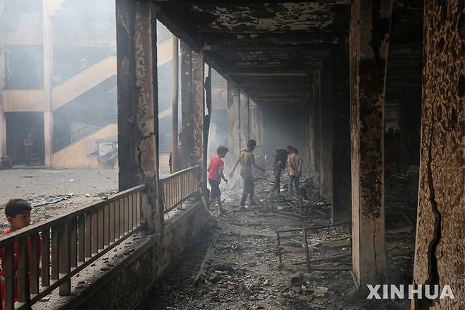 [가자시티=신화/뉴시스] 23일(현지 시간) 가자지구 가자시티의 한 학교에 대피해 있던 팔레스타인 어린이들이 이스라엘의 공습으로 파손된 건물 잔해를 살피고 있다. 이스라엘군 당국은 이날 성명을 통해, 피란민들이 머물고 있던 학교를 겨냥한 야간 공습은 이곳에 숨어있는 무장세력을 목표로 한 것이라고 밝혔다. 가자 보건 당국은 이번 공습으로 최소 10명이 숨졌으며, 학교 내 난민 천막과 교실에서 화재가 발생했다고 전했다. 2025.04.24.