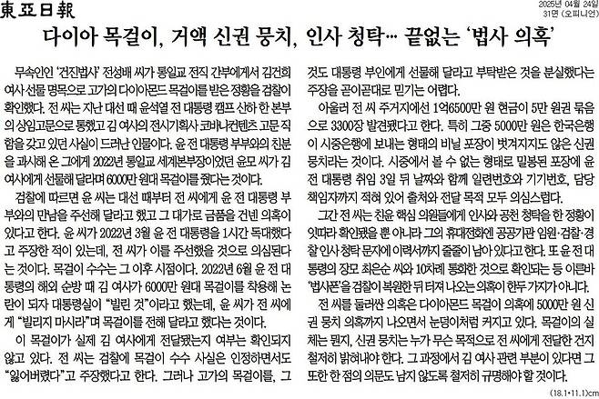동아 = 다이아 목걸이, 거액 신권 뭉치, 인사 청탁…끝없는 '법사 의혹'