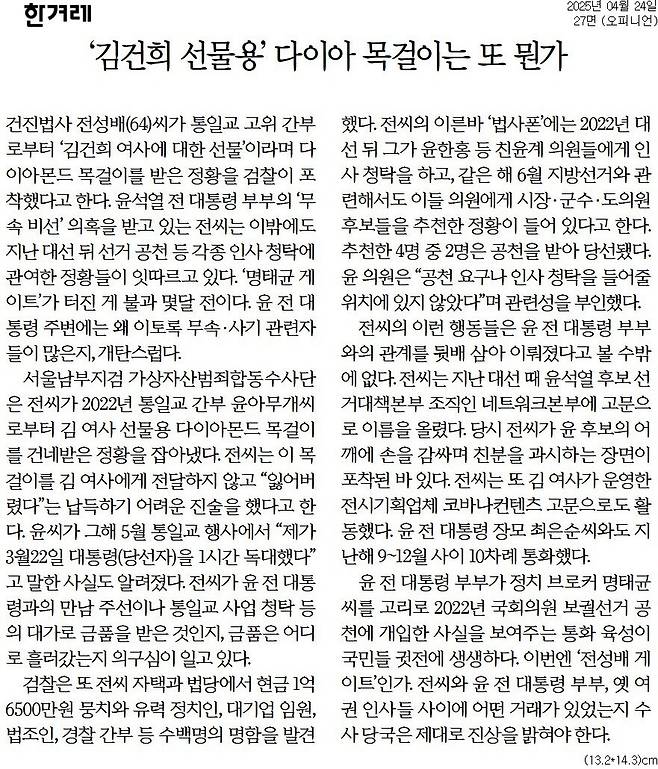 한겨레 = '김건희 선물용' 다이아 목걸이는 또 뭔가
