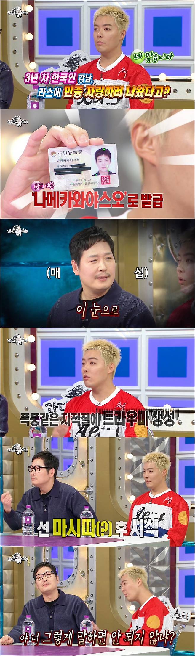 한국 귀화 3년 차라는 강남은 당당하게 주민등록증을 공개했다. 원래 이름인 나메카와 야스오로 발급받았다는 강남은 "등록할게 너무 많아서 일단 이 이름으로 했다. '용산 나씨'다. 이제 완전 한국 사람이다. 나중에 개명을 하려고 한다"고 밝혔다.