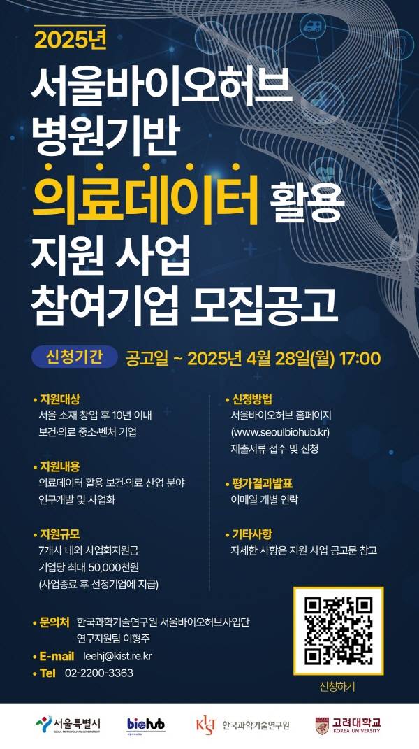 서울바이오허브 관계자는 “의료데이터는 보건·의료산업 분야 스타트업의 혁신을 가속하는 핵심 자원”이라며 “이번 사업은 스타트업이 의료데이터를 활용한 연구개발부터 사업화까지 도전할 수 있도록 충실한 마중물 역할을 하게 될 것”이라고 말했다.