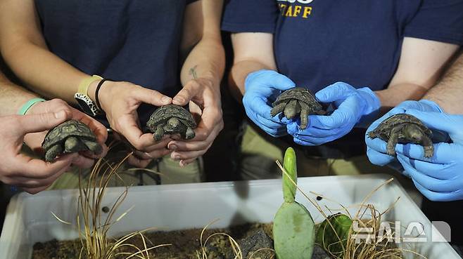 [필라델피아=AP/뉴시스] 23일(현지 시간) 미 펜실베이니아주 필라델피아 동물원에서 이곳 직원들이 약 100살 된 갈라파고스 거북 ‘마미’가 부화시킨 새끼 거북 네 마리를 공개하고 있다. 마미는 지난 2월 처음으로 새끼 네 마리를 부화시켜 동물원 150년 역사상 최초의 갈라파고스 거북 부화 사례를 기록했으며, 최고령 초산으로도 이름을 올렸다. 2025.04.24.