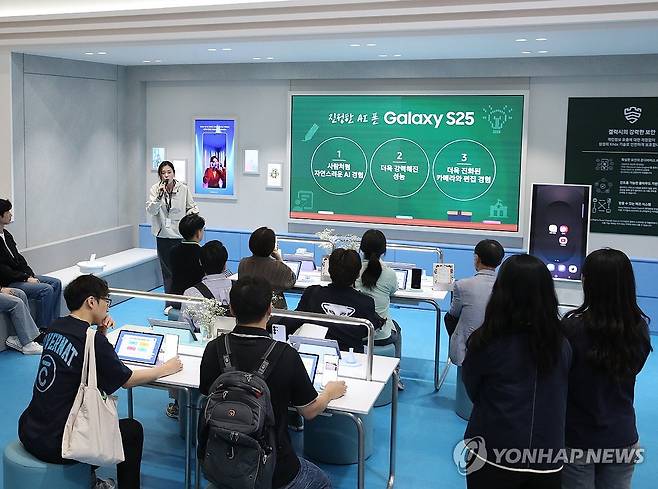 (서울=연합뉴스) 삼성전자가 오는 26일까지 서울 강남구 코엑스에서 열린 '2025 월드IT 쇼'에 참가해 진화한 '갤럭시 AI'가 제안하는 새로운 일상을 선보인다고 24일 밝혔다. 관람객들이 '갤럭시 AI 클래스'에 참여하고 있다. 2025.4.24 [삼성전자 제공. 재판매 및 DB 금지]