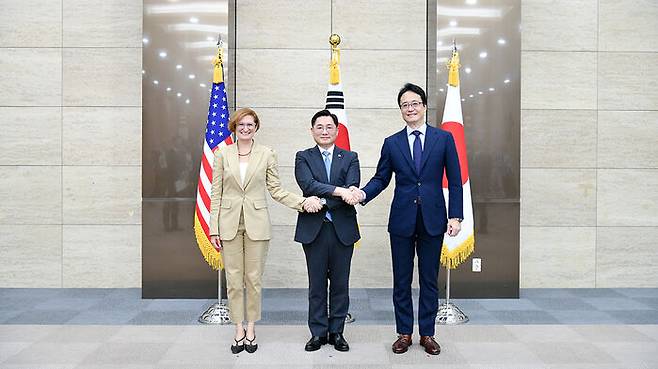 ▲ 제15차 한미일 안보회의(DTT)에서 기념 촬영하는 조창래 국방부 국방정책실장(가운데), 카라 에버크롬비(Cara ABERCROMBIE) 미합중국 국방부 정책부차관 대리(왼쪽), 야마토 타로(YAMATO Taro) 일본 방위성 방위정책국장.