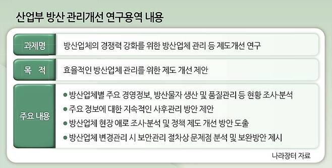 ▶외국인 임원 선임 따른 보안문제 해소=24일 조달청 나라장터에 따르면 산업통상자원부는 최근 ‘방산업체의 경쟁력 강화를 위한 방산업체 관리 등 제도개선 연구’ 용역을 발주했다. 첨단 기술 기반의 무기체계 확산, 방산 수출 확대 등 산업구조 전환에 맞춰, 업체 관리제도를 전면 재정비하기 위한 목적이다.