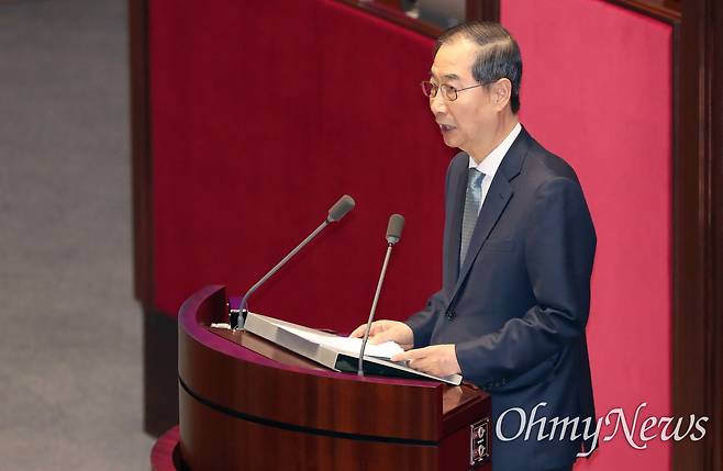 한덕수 대통령 권한대행 국무총가 24일 오전 국회 본회의에서 시정연설을 통해 추가경정예산에 대한 신속한 처리를 주문했다. 이에 대해 우원식 국회의장은 시정연설을 마친 한 대행에 대해 "할 일과 하지 말아야 할 일을 잘 구별해달라"고 따끔한 일침을 가했다.