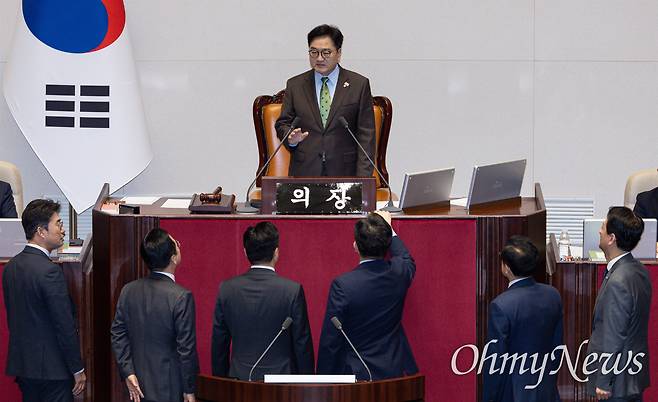 | ▲ 권성동 국민의힘 원내대표가 24일 오전 서울 여의도 국회 본회의장에서 열린 제242회 국회(임시회) 제6차 본회의에서 우원식 국회의장의 발언에 항의하고 있다. |
