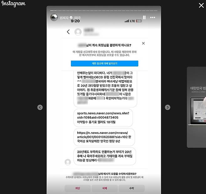 | ▲ '부산 돌려차기 사건'의 피해자 김진주(필명)씨가 23일 자신의 인스타그램에 올린 2차 가해자로부터 받은 글의 일부. |