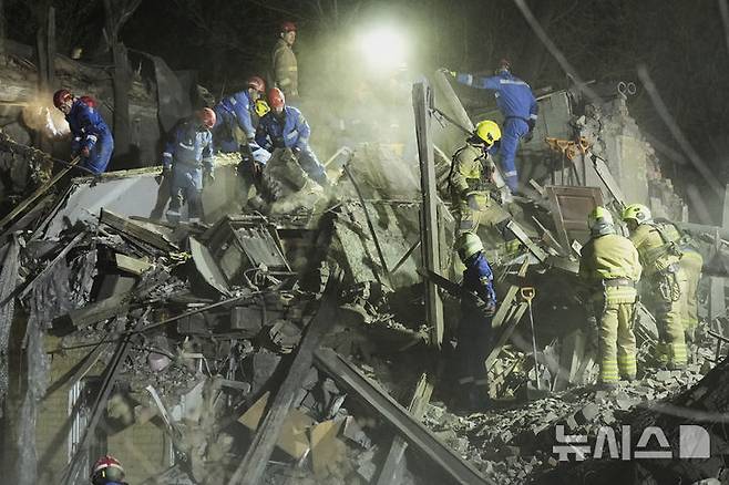 [키이우=AP/뉴시스] 24일(현지 시간) 우크라이나 키이우에서 구조대원들이 러시아의 탄도미사일 공격으로 무너진 건물 잔해를 치우고 있다. 비탈리 클리치코 키이우 시장은 러시아의 대규모 공격으로 최소 2명이 숨지고 어린이 6명과 임산부 등 54명이 다쳤다고 밝혔다. 2025.04.24.