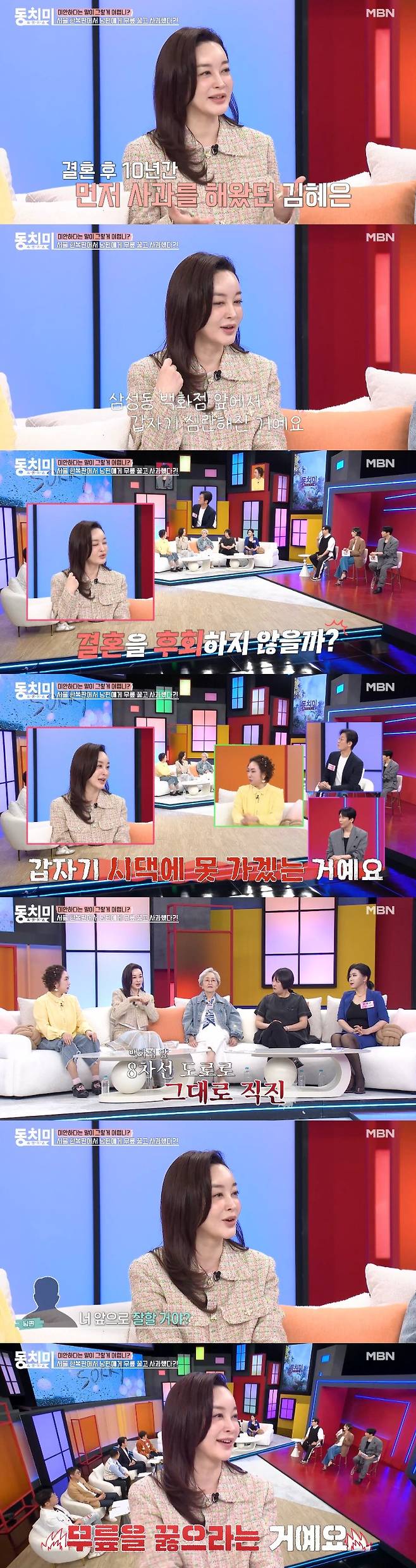이어 김혜은은 "그 백화점 앞에 제가 무릎 꿇고 '잘못했으니 뛰어들지 마라'라고 했다. 그때부터 제 군기를 잡고 '차렷 열중 쉬어' 이런다"고 이후로 시작된 결혼 생활을 전했다.