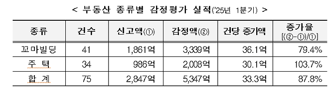 반면, 신고액 대비 감정가액 증가율은 주택이 더 높았다. 주택의 건당 증가액 30억1000만원, 증가율은 103.7%였다. 특히 단독주택의 신고액 대비 감정가액 증가율(151%)이 다른 주택 유형보다 특히 높았다.