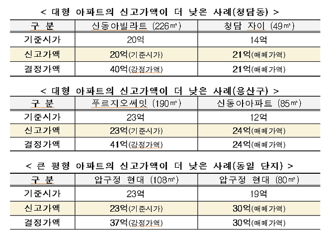 대형 아파트인 청담 신동아빌라트(226㎡)의 신고액(기준시가 20억원)은 인근 청담 자이 중·소형(49㎡)의 신고액(매매가액 21억원)보다 낮았다. 같은 단지 내에서도 더 큰 평형 아파트의 신고액이 더 낮은 사례도 있었다.