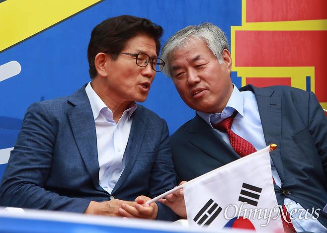 | ▲ 2020년 초 코로나19로 인한 집합금지 명령을 어기고 전광훈 목사의 사랑제일교회 현장 예배에 참석한 김문수 국민의힘 대선 경선 후보에게 24일 벌금형이 확정됐다. 사진은 지난 2019년 8월 15일 서울 광화문광장에서 열린 집회에 김 경선 후보와 전광훈 당시 한기총 회장이 이야기를 나누는 모습이다. |