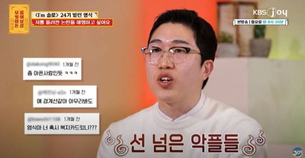 지난 21일 방송된 KBS Joy 예능 프로그램 ‘무엇이든 물어보살’에는 연애 예능프로그램 ‘나는 솔로’ 24기 너드남 특집에 ‘영식’으로 출연했던 사연자가 직장 상사와 함께 등장했다. 이날 사연자는 “(프로그램에) 너무 몰입하다 보니 의도치 않게 빌런이 됐고, 비판을 넘어 질타를 받고 있다”고 고백했다. 논란이 된 언행 중 하나는 첫날 자신에게 호감을 보였던 여성 출연자 ‘옥순’이 아닌 다른 여성과의 데이트 중 “너는 시뮬레이션 도구”라고 말한 것이었다. 이에 서장훈이 “사람들이 뭐라고 욕하냐”고 묻자, 사연자는 “경계선 지능장애, 찐따라는 말까지 들었고, 가장 심한 건 부모님 욕이었다”며 “일상생활이 힘들 정도였다”고 말했다. 서장훈은 “방송을 위한 콘셉트로 이해해달라”며 “악플은 자제해달라”고 했다.