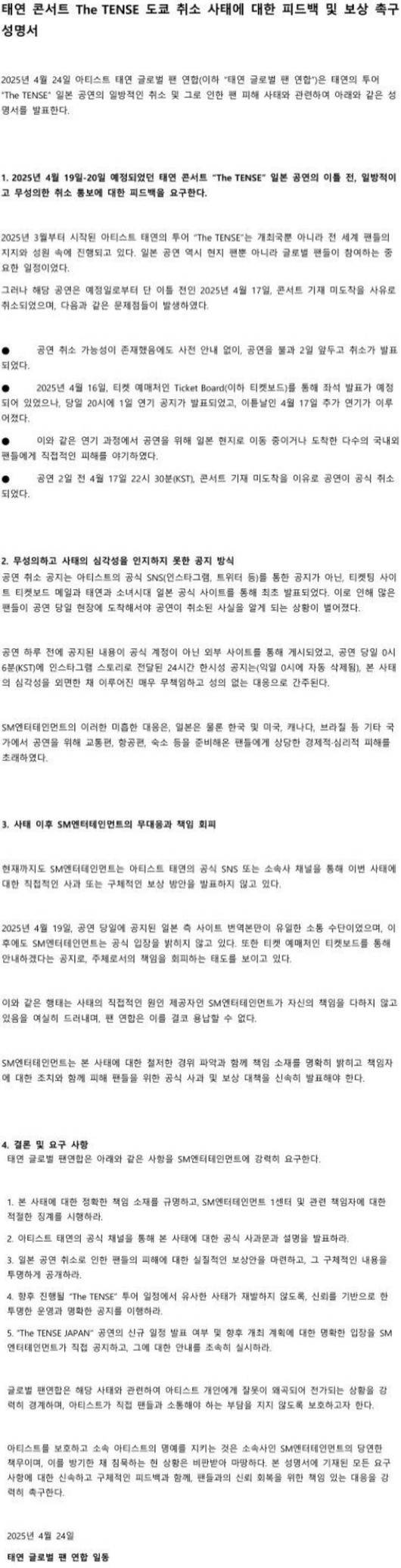 이에 태연 글로벌 팬연합은 총 5가지 구체적 대응을 요구했다. 이들은 '본 사태에 대한정확한 책임 소재를 규명하고 SM엔터테인먼트 1센터 및 관련 책임자에 대한 적절한 징계를 시행할 것', '아티스트 태연의 공식 채널을 통해 본 사태에 대한 공식 사과문과 성명을 발표할 것', '일본 공연 취소로 인한 팬들의 피해에 대한 실질적인 보상안을 마련하고, 그 구체적인 내용을 투명하게 공개할 것', '향후 진행될 ’The TENSE’ 투어 일정에서 유사 사태가 재발하지 않도록 시노리를 기반으로 한 투명한 운영과 명확한 공지를 이행할 것', ’The TENSE JAPAN’ 공연의 신규 일정 발표 여부 및 향후 개최 계획에 대한 명확한 입장을 SM 엔터테인먼트가 직접 공지하고 그에 대한 안내를 조속히 실시할 것'을 촉구했다.