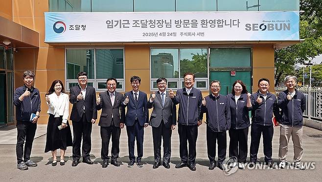 (대전=연합뉴스) 임기근 조달청장(가운데)이 24일 공기조화기 제조업체인 부산시 강서구 서번을 방문, 직원들과 간담회를 하고 기념 촬영을 하고 있다. 2025.4.24 [조달청 제공. 재판매 및 DB 금지]