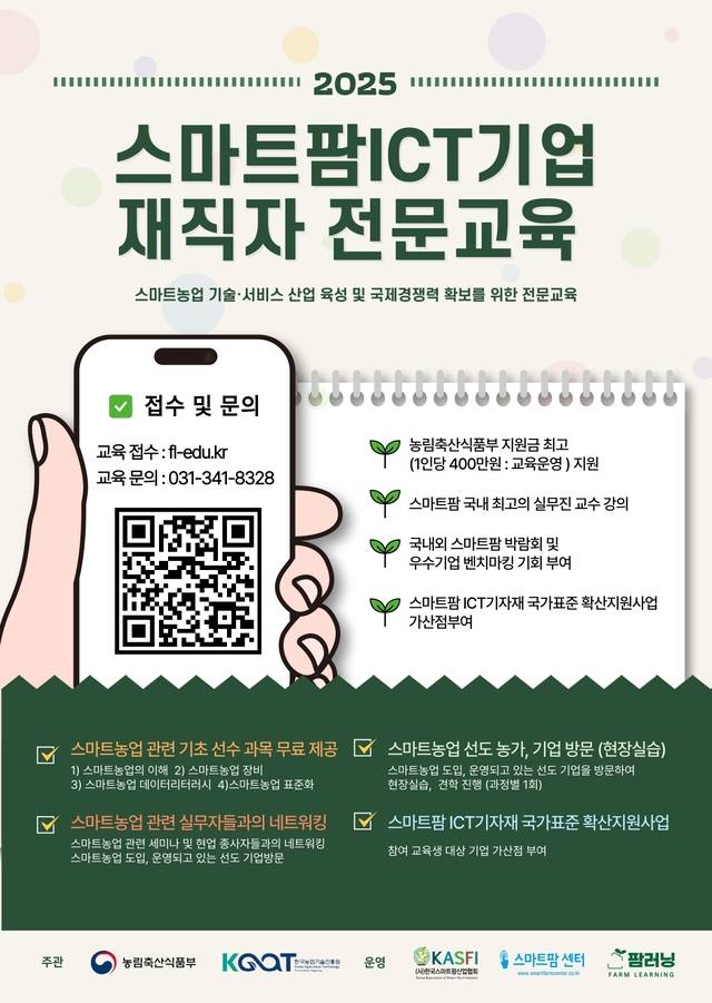 교육은 ‘스마트팜·수직농장 기술 활용’ ‘노지 스마트팜과 AI 적용’ ‘스마트축산’ 등 9개 세부과정으로 이뤄지며, 11월까지 온라인 이론수업과 현장 실습교육을 병행하는 방식으로 진행된다. 해외 박람회와 우수기업 벤치마킹 기회도 제공될 예정이다.
