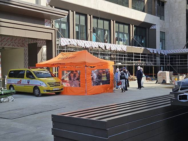 | ▲ 2월 14일 반얀트리 화재참사 발생 당일 화재현장 앞에 설치한 사고수습본부 부스 |