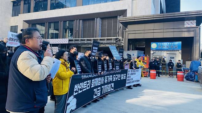 | ▲ 2월 22일 개최한 '반얀트리 화재참사 유가족 요구안 발표 기자회견' 모습(반얀트리 화재참사 유가족과 부산운동본부 공동주최). |