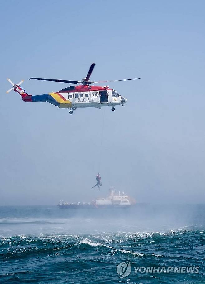 (부산=연합뉴스) 24일 오후 부산 강서구 진우도 남방 해상에서 항공기가 해상에 불시착한 것을 가정해 열린 합동 구조 훈련에서 해경 헬기가 익수자를 구조하고 있다. 이번 훈련은 김해공항에 착륙하려던 항공기가 조류 충돌로 인해 인근 해상에 불시착한 상황을 가정해 부산해양경찰서 등 13개 기관이 참여했다. 2025.4.24 [부산해양경찰서 제공. 재판매 및 DB 금지]