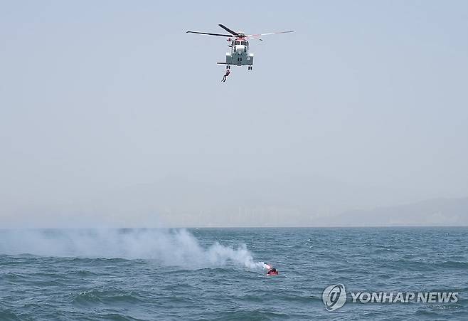 (부산=연합뉴스) 24일 오후 부산 강서구 진우도 남방 해상에서 항공기가 해상에 불시착한 것을 가정해 열린 합동 구조 훈련에서 해경 헬기가 익수자를 구조하고 있다. 이번 훈련은 김해공항에 착륙하려던 항공기가 조류 충돌로 인해 인근 해상에 불시착한 상황을 가정해 부산해양경찰서 등 13개 기관이 참여했다. 2025.4.24 [부산해양경찰서 제공. 재판매 및 DB 금지]