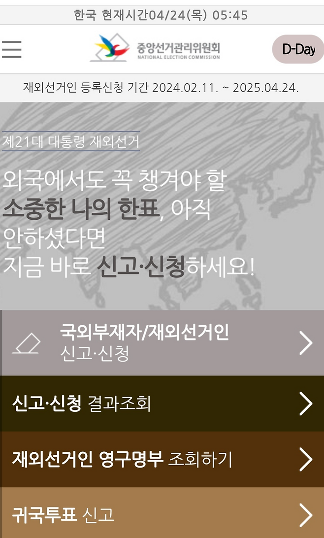 어디서부터 시작해야 할지 몰라 검색창에 '재외국민 투표 신청'을 쳤더니 가장 먼저 뜬 건 중앙선거관리위원회의 재외선거 웹사이트였다. 사이트는 깔끔했고, 설명도 친절했다. 생각보다 준비할 것도 많지 않고 여권번호, 주민등록번호 그리고 현재 거주 중인 미국 주소만 있으면 충분했다.