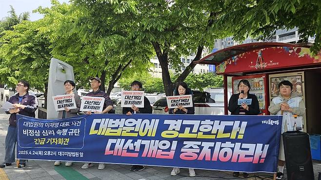대구촛불행동은 2025년 4월 24일 오후 2시 대구지방법원 앞에서 '대법원의 비정상 심리 속행 규탄 긴급 기자회견'을 개최하였다.