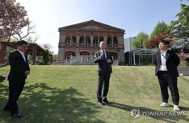 (서울=연합뉴스) 류영석 기자 = 콜린 크룩스 주한 영국대사가 24일 정동야행 프레스투어가 진행 중인 서울 중구 정동 주한영국대사관에서 취재진에게 대사관저를 소개하고 있다. 2025.4.24