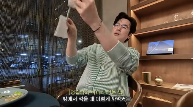 이에 김강우는 "저는 약간 결벽증이 있다. 만약에 바나나면, 봉투를 잡아서 휴지를 잡고 깐다. 농약이 묻어있으니까. 아기 키우면서 이렇게 된 거 같다"라고 인정했다.