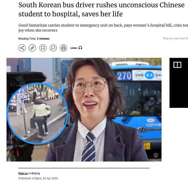 24일 사우스차이나모닝포스트(SCMP)는 ‘한국의 버스기사 의식 잃은 중국 유학생 생명 구했다’는 제목으로 현지 네티즌 반응을 담은 기사를 보도했다.